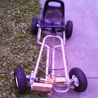 This is the go-cart my 15-year-old son has been building this summer. He started with a frame, seat and a steering wheel. He replaced the wheels, put on a brake, bolted together angle iron, sawed two boards to be the pedals and has been setting up a way to strap an actual engine to the back of it.