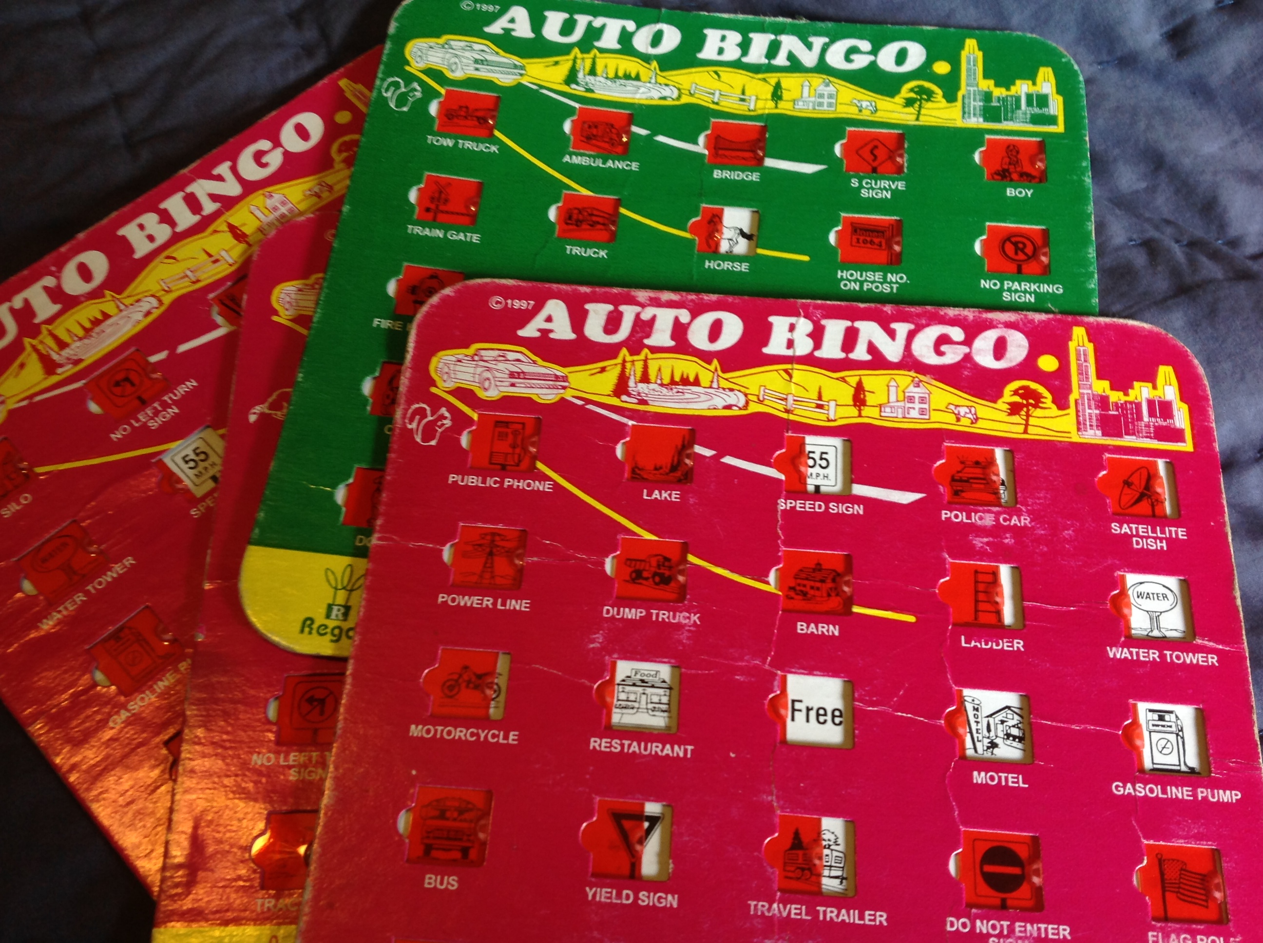 When my girls were little, we found these cool Road Trip Bingo cards at Cracker Barrel. We stocked up and wound up with half a dozen of these cards to keep everyone amused while we drove to whatever vacation we were taking. Sometimes, they'd even pull them out as we drove around town on errand days.