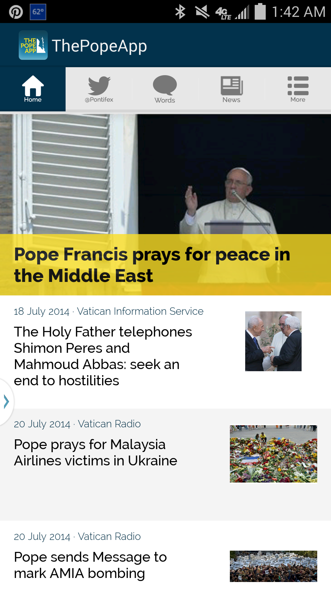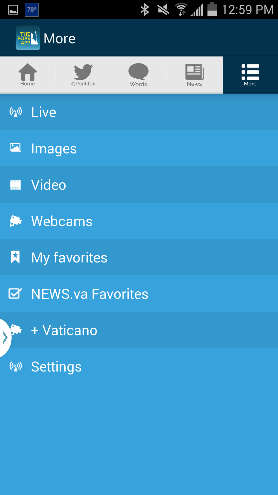 Lastly found in the MORE category the +Vaticano selection, which in addition to the link to the Pope’s Twitter feed, provides web links to Vatican.va; News.va; Agencia Fides, L’Osservatore Romano, Press Office, Vatican Radio, and the Vatican Radio App.