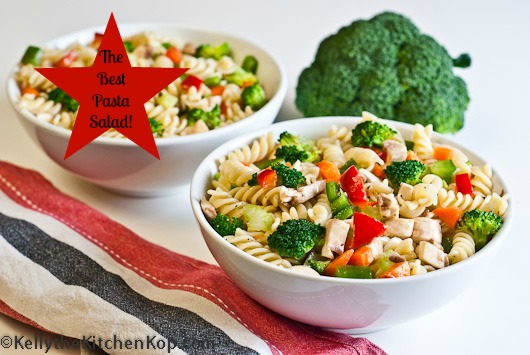 Soon our garden will be bursting with fresh tomatoes and peppers, so along with the other veggies that I can snag at the farmer’s market and the real foodie dressing ingredients, this makes the BEST pasta salad recipe because all the flavors blend so perfectly together. It’s also a super easy salad to throw together for your summer cook-outs — it’ll be a hit!