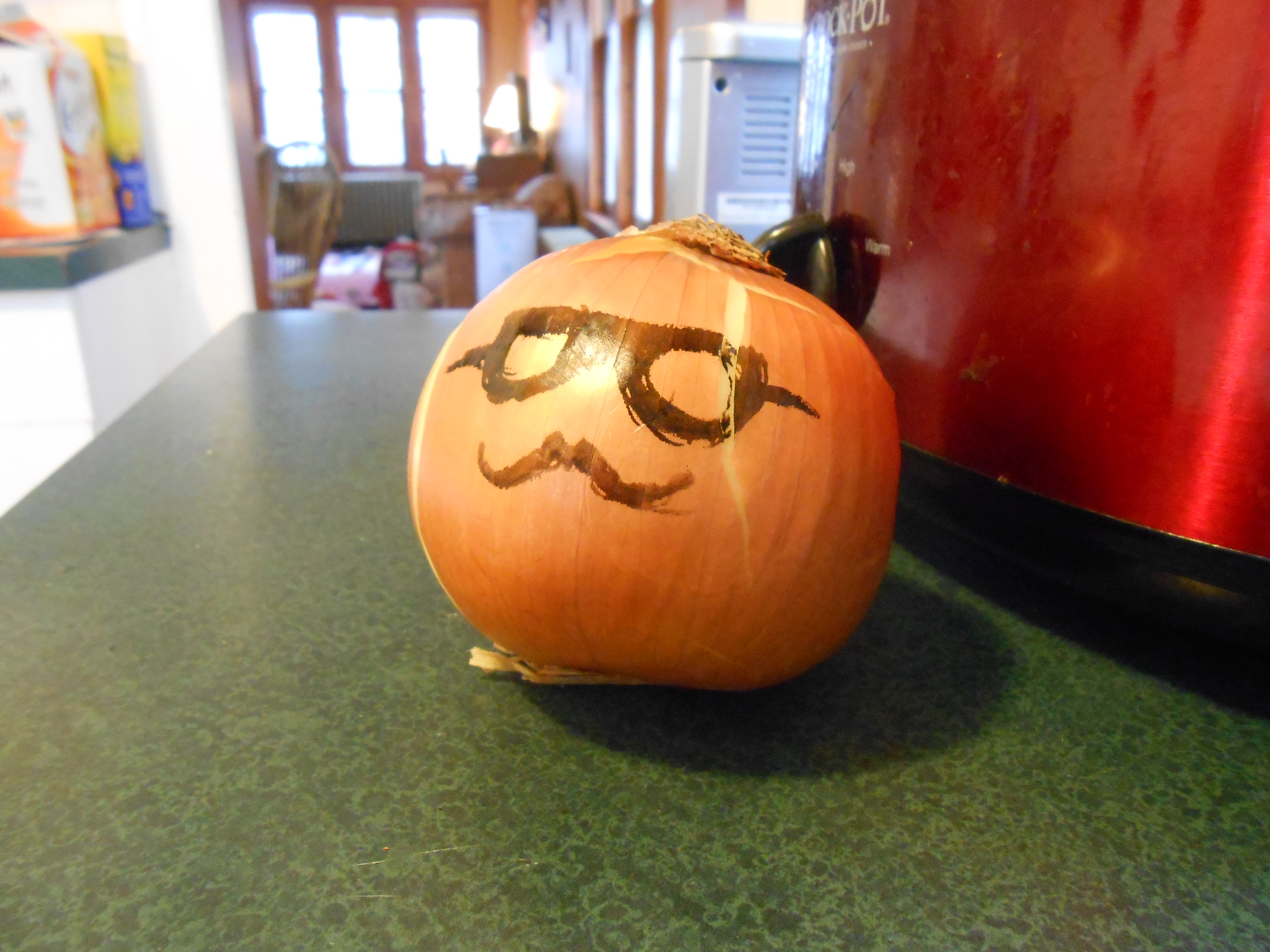 I handed the bag back to Mom, and she put it on the kitchen counter. Then she reached down a Sharpie marker from a kitchen cabinet. With the marker she drew a black, Zorro style mask on the onion, turning it into a Vidalia bandit. She put the masked onion back in the bag and handed it to me, still chuckling.