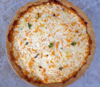 Layer the tomatoes, basil and onion in the pie shell. Sprinkle with salt and pepper. Spread your cheese and yogurt mixture on top of the tomatoes and allow to cook for 30 minutes or until the top is lightly browned.