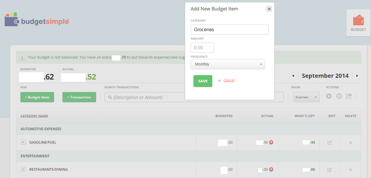 Creating a budget category is easy. One simply has to click on the +Budget Item button, select a category, sub-category, or create a category to allocate funds, and then enter how often the budgeted amount is usually for. Once a budget item is created, one can then add their actual expenses against it by clicking the red plus sign in the budget category. There is a date, amount, and description field whenever a transaction/expense is added, something an Excel spreadsheet simply won't do.