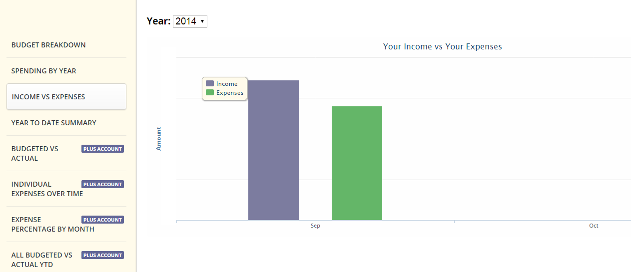 BudgetSimple also has some basic reporting as to what the breakdown of the budget is, Where is all the money going? How is the income vs. expense balancing out? There are graphs and charts which answer these questions, and some more advanced ones for premium/plus account members.