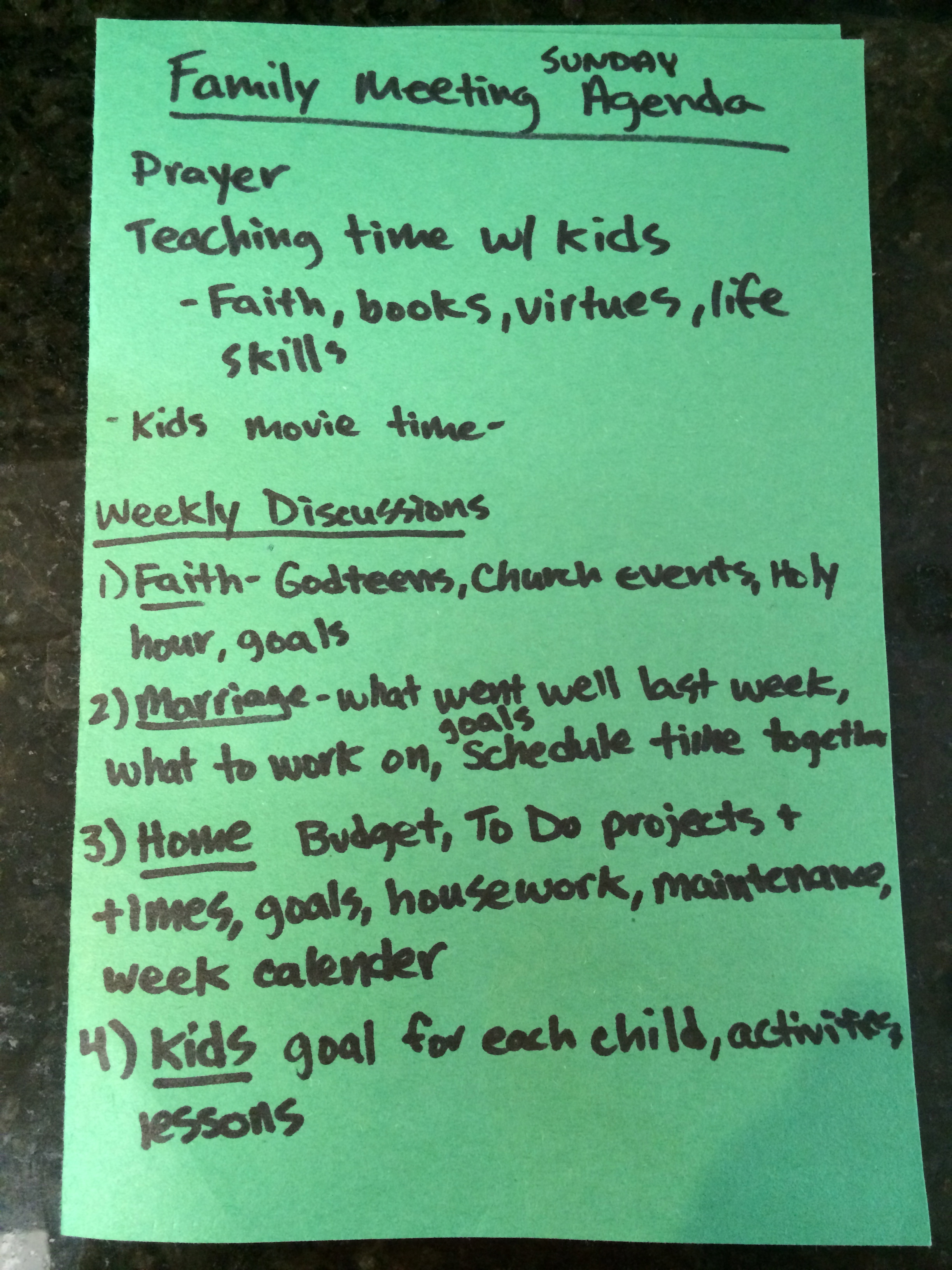 I love how Philip structured our family meeting agenda. It mirrors the hierarchy of relationships we want our family to have. In our house, that means that God is first, our marriage is second, kids are third, and everything else follows.