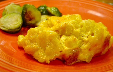 In a buttered casserole dish (13 x 9 or round) pour macaroni.