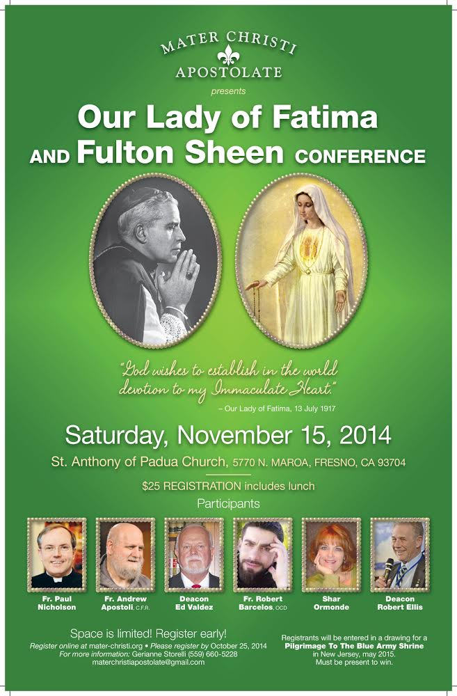 The Mater Christi Apostolate invites you to attend a one day "Our Lady of Fatima and Fulton Sheen Conference" on November 15th in Fresno, California. Noted speakers for this event include: