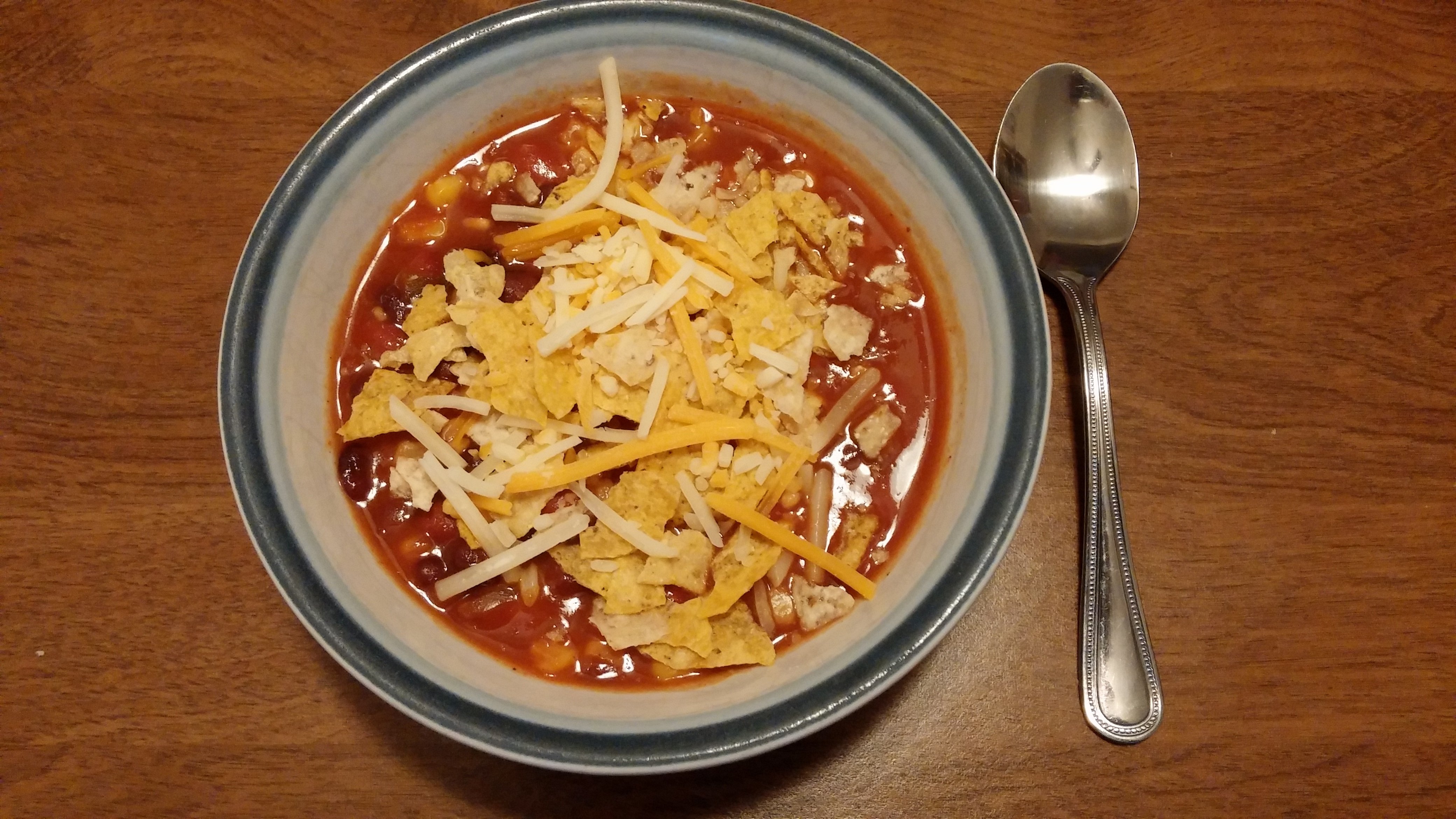 Garnish soup with crushed tortilla chips and shredded cheddar cheese.