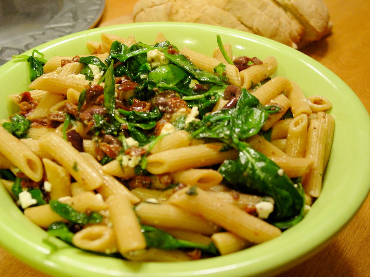 In the same pot, heat the oil over medium heat. Add the garlic and cook for 2 minutes -- do not brown. Add tomatoes, parsley, and basil, and cook, stirring occasionally, for two minutes longer. Add the pasta, spinach, cheese and olives, and toss to coat well. Add a little of the pasta water if necessary to moisten.