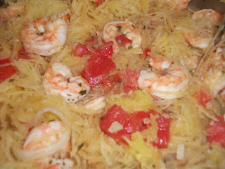 Cook the squash. I usually cut it in half, scoop out the seeds, place it, skin side up, in a lidded saucepan with an inch of water, and boil it for about 20 minutes. Remove from pan and let cool. Meanwhile, saute onions and garlic in a bit of olive oil until soft and lightly browned. While it is cooking, use a fork to remove the spaghetti squash from the shell. Cook shrimp and then add the tomato. Add squash and mix until combined. Add salt, pepper, and parsley to taste.