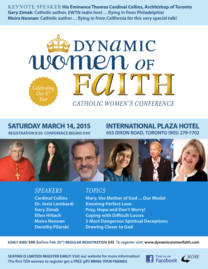 Catholic Women's Conference Dynamic Women of Faith with speakers including: Cardinal Collins, Gary Zimak, Moira Noonan, EllenGable Hrkach, EnzaRattenni, Dorothy Pilarski, Tanya Granic Allen. Learn more and register online at dynamicwomenfaith.com/program/