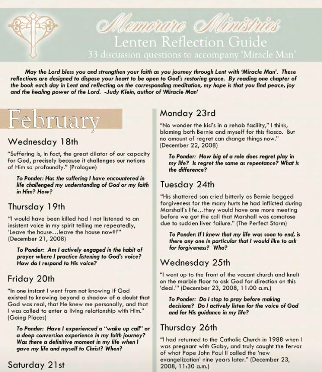 With this in mind, I am offering a free Lenten Reflection Guide that is meant to prompt honest prayer, reflection and spiritual growth during this holy season. The Reflection Guide, which provides thirty-three short Lenten meditations (one to go along with each chapter of Miracle Man) is available as a free download on my website at http://memorareministries.com/chaos-free. By reading one short chapter of Miracle Man each day in Lent and pondering the corresponding reflection question, I hope that you will realize the happy reward of attaining a better understanding of yourself and a deeper relationship with God.