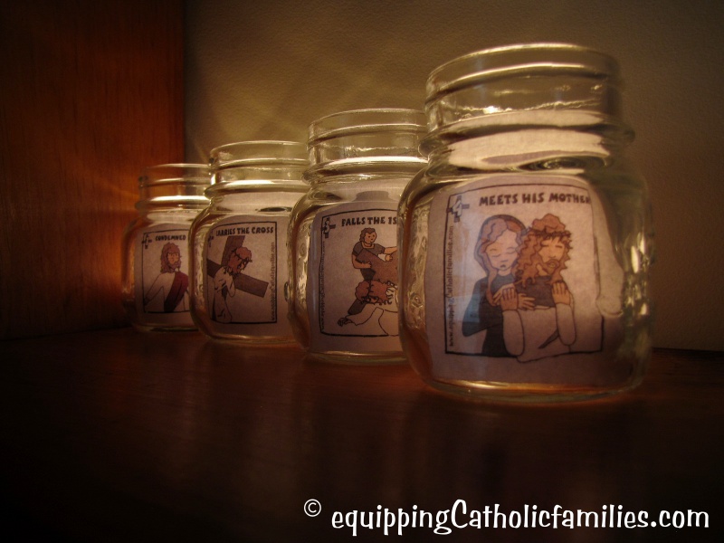 There are actually 4 different templates of the images within the kit, and I specifically designed the set of 2" square cards for votive candles! These little Stations can be mod-podged onto baby food jars (or inserted carefully inside as shown in the picture)! A tea light in each jar can be lit as the Stations of the Cross are prayed and reflected upon.