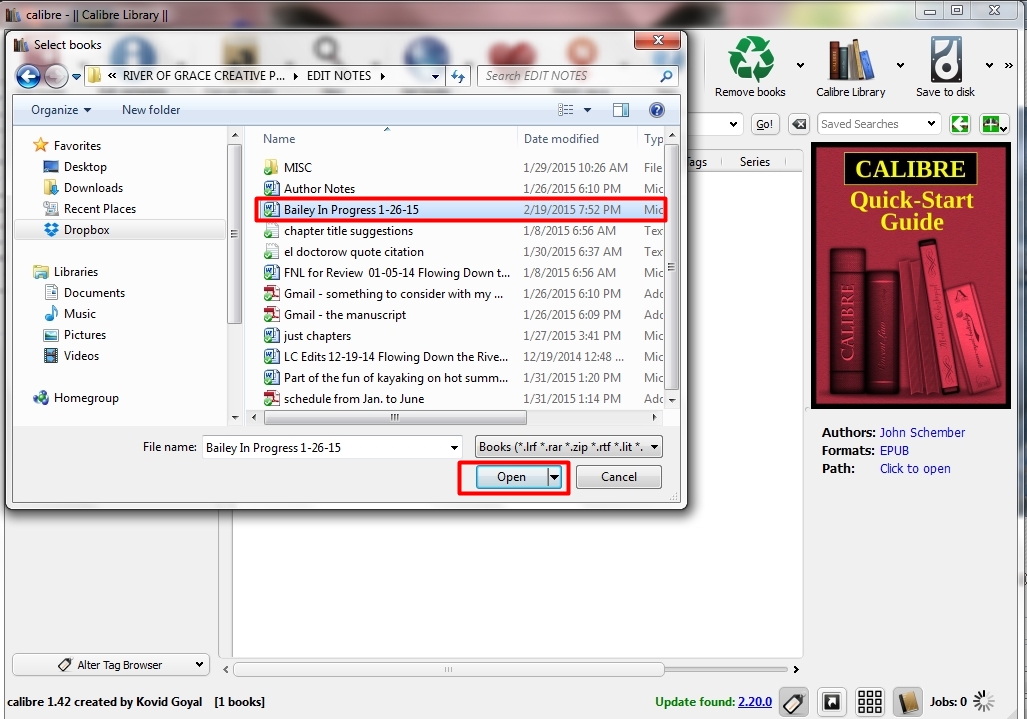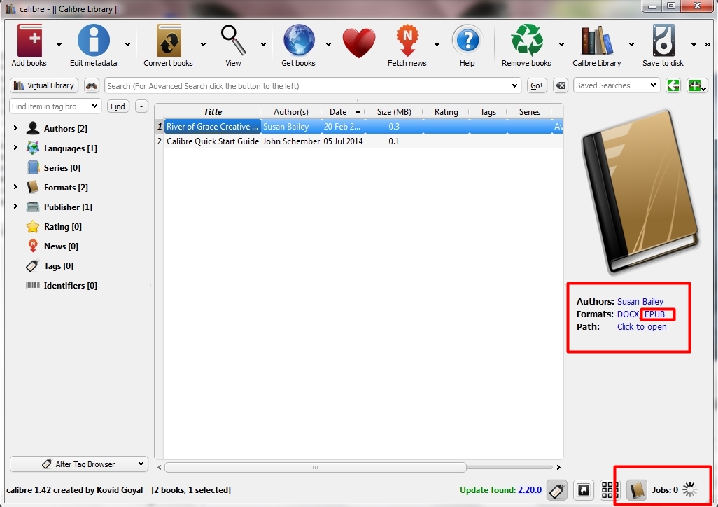 You will be sent back to the main page of Calibre where you will see your progress in the lower right hand corner. Once done, you will see below the large book picture either EPUB or MOBI. Selecting “Click to open” will open up the folder on your computer where the eBook has been placed.