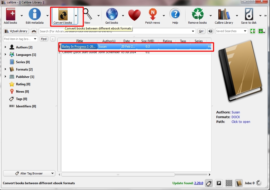 Your document will appear on the list in Calibre; making sure it is selected, click on “Convert books”: