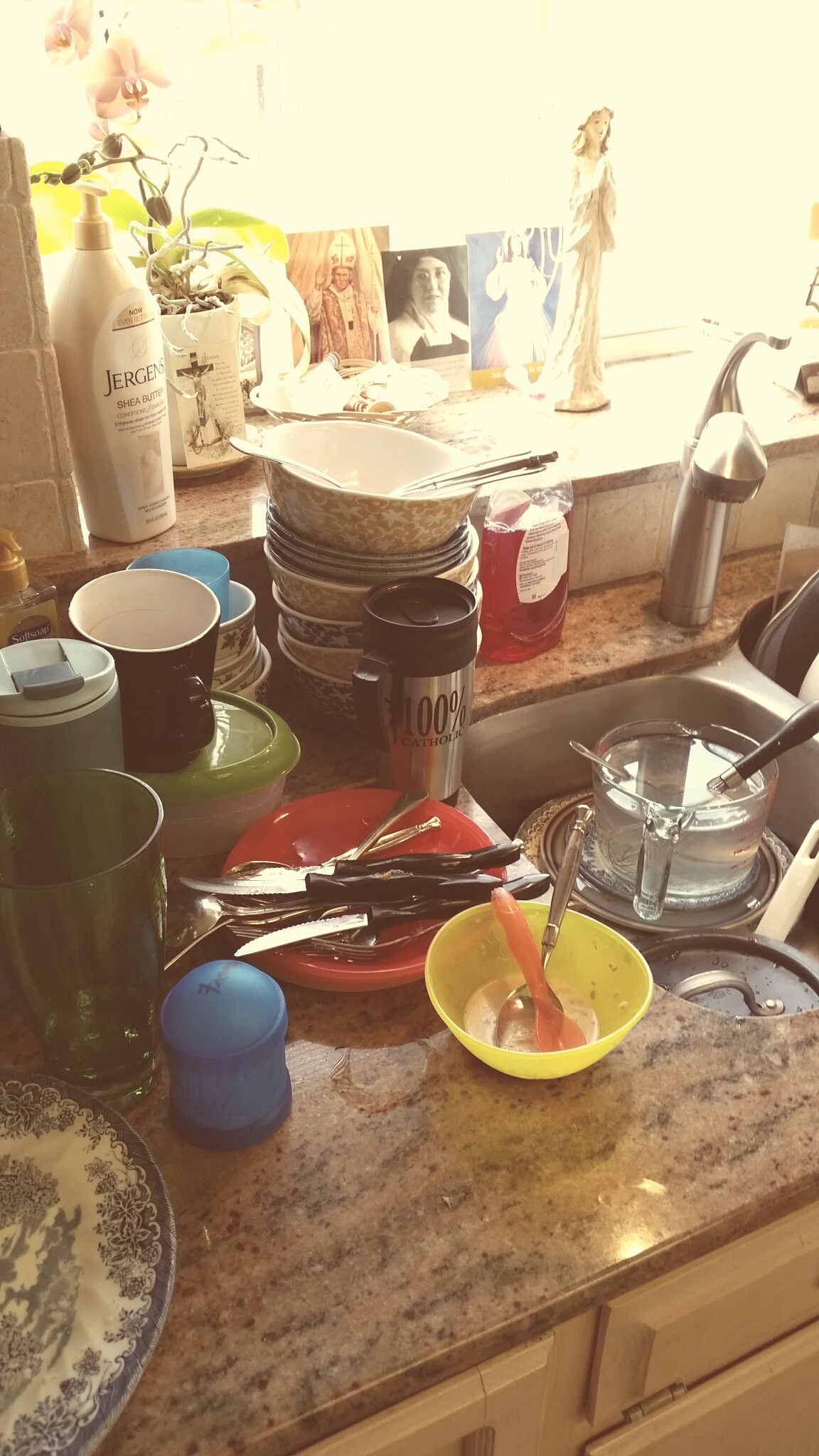 When I "do the dishes" for somebody, I try to do an over-and-above great job. I know what a blessing it is to relieve somebody of this grueling daily work, and I realize that it is a real help to start the next day with a clean kitchen. I am the kind of person who leaves that kitchen sparkling. As in, I wipe out your microwave and scrub off the high chair and arrange the hand soap and little statue of Mary behind your sink just-so kind of sparkling.