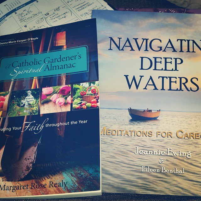 The first best thing in my mail was a copy of Margaret Rose Realy’s new book, A Catholic Gardener’s Spiritual Almanac, and Jeannie Ewing & Eileen Benthel’s Navigating Deep Waters: Meditatiosn for Caregivers. I am eager and excited to dive into both in the coming weeks!!