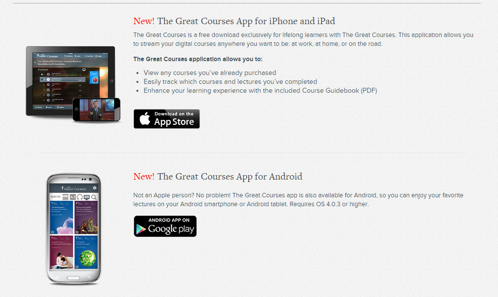 The Great Courses program additionally offers an app for both iOs and Android to help you not only manage your courses, but also provide you flexibility of viewing them. The App allows you to access your digital library (free streaming), download the accompanying guidebook, learn more about the course and the professor teaching it, and access both the audio (and if applicable video) of your course lectures.