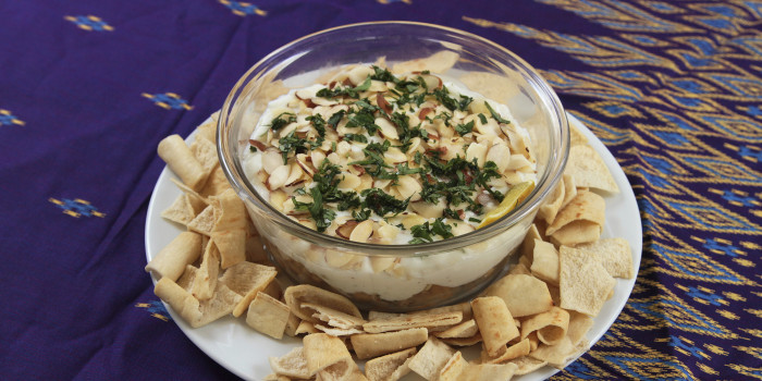 Combine drained yogurt, fresh and dry mint, and crushed garlic in a bowl. In a pan, heat chickpeas in their liquid until warm, then drain and set aside. Toast pita bread in oven until golden in color. Break some of the pita bread and place pieces in a large bowl with chickpeas. Add yogurt mixture. Top with fresh mint and toasted almonds. Drizzle olive oil over top. Serve with remaining pita bread.