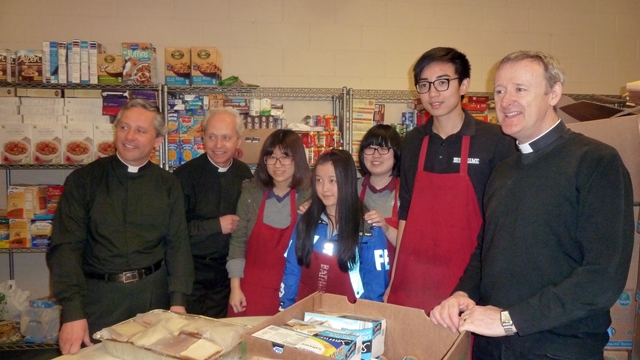 The Priests were given a full tour of the facility by manager Bill Riley, who explained that some 2000 people are serviced each week through the twice-weekly hot meals and foodstuffs given to families. Father Eugene, Father Martin and Father David chatted with many of the volunteers, including students from Holy Name High School. Some of the students were on exchange from China.