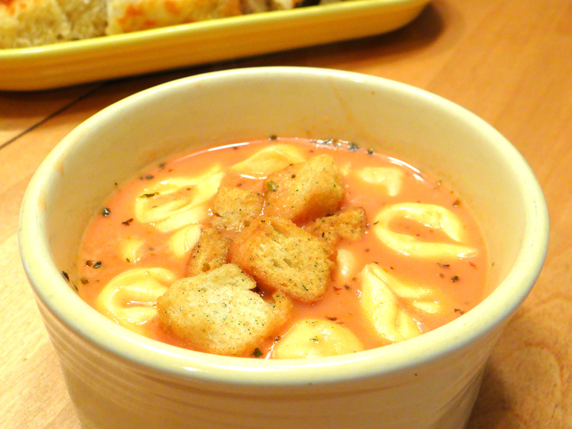 Heat olive oil over medium heat in a medium soup pot. Add garlic and cook just until fragrant -- don’t brown it. Add the tomato soup, milk, half and half, vegetable broth, and all the seasonings. Bring to a slow simmer. Taste and adjust seasoning if necessary. Once simmering, carefully drop in the tortellini and cook according to package instructions (probably about 7 - 10 minutes). Serve hot with Parmesan and croutons on top, if desired.
