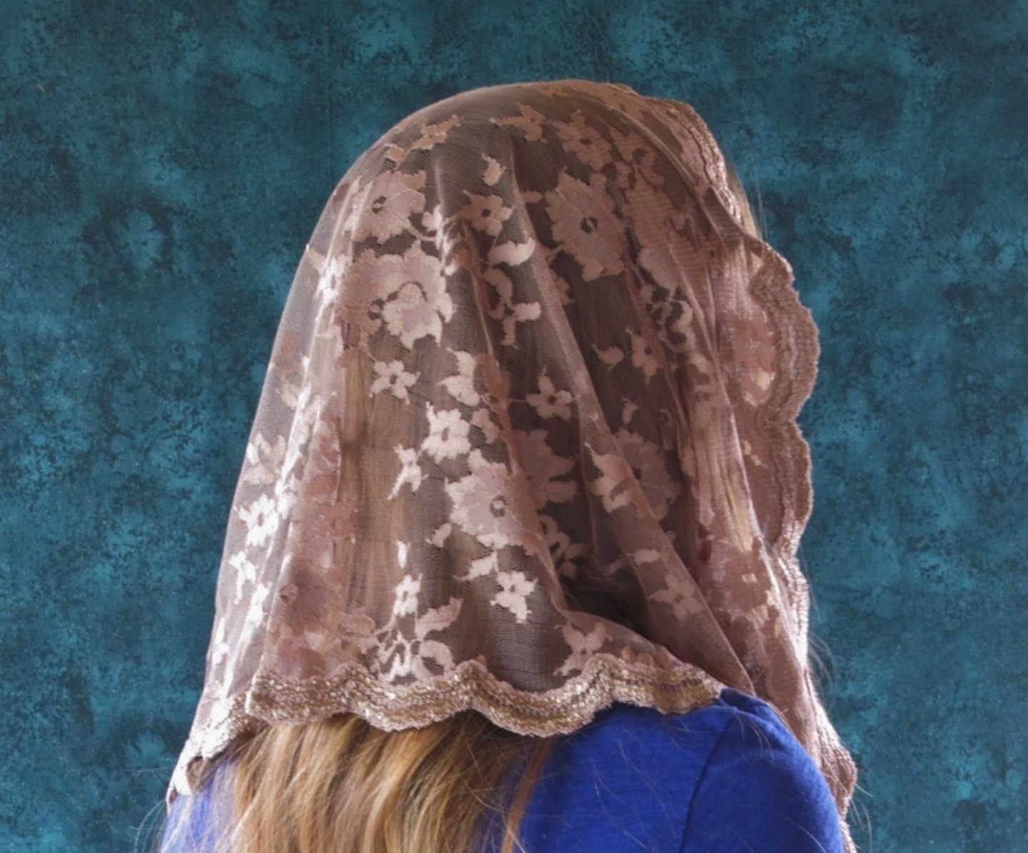 It has been almost a year now that I wear a lace mantilla that is stretchy and ties, and love it. Now, I always carry it in my purse so that if I can stop and visit our Lord I have it with me.
