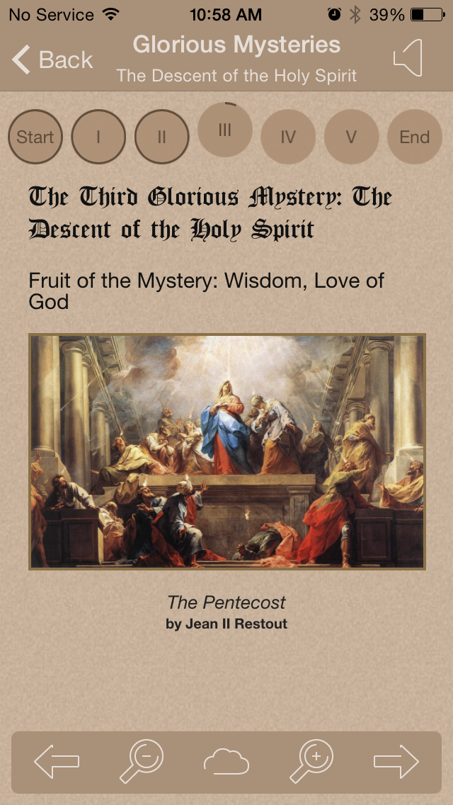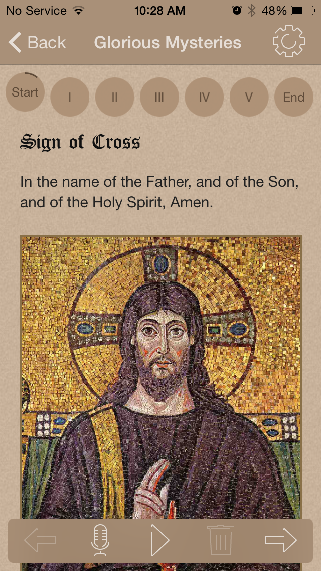 Each mystery begins with the Sign of the Cross and includes an icon of Jesus to gaze upon. Swiping the bottom moves you throughout the course of the rosary. All the prayers are written out and each mystery includes the Fruit along with an image to meditate upon.