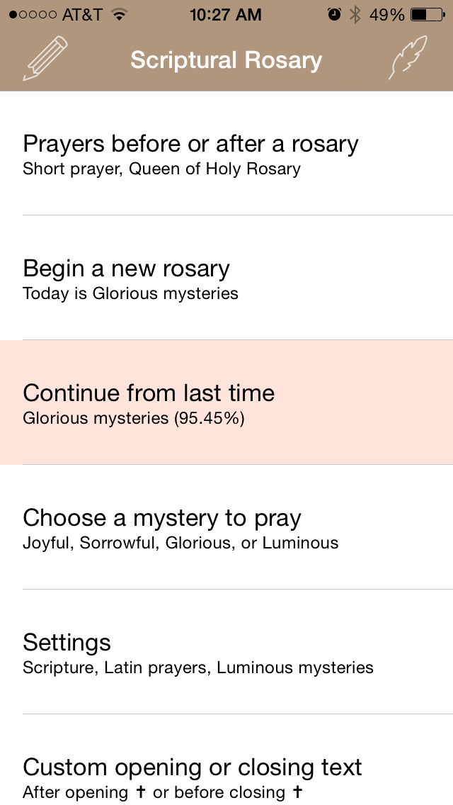 This is an app that gets right to the point. From the screenshot you can see that it opens to the main menu. There are five prayers to choose from that you can pray before you start your rosary. You simply swipe the bottom to move from one prayer to the next.