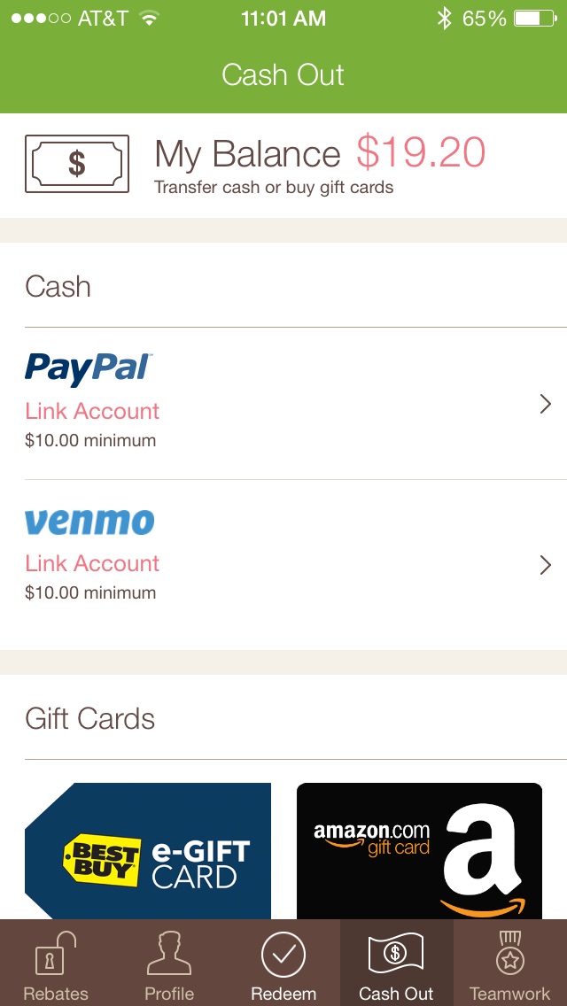 Once your total is at least $10, you can cash out to PayPal or venmo, or you can get gift cards to retailers like Amazon, Best Buy, Starbucks, WalMart, iTunes, and a few others. Ibotta seems to be working on partnering with more retailers, so I expect this to expand in the future.