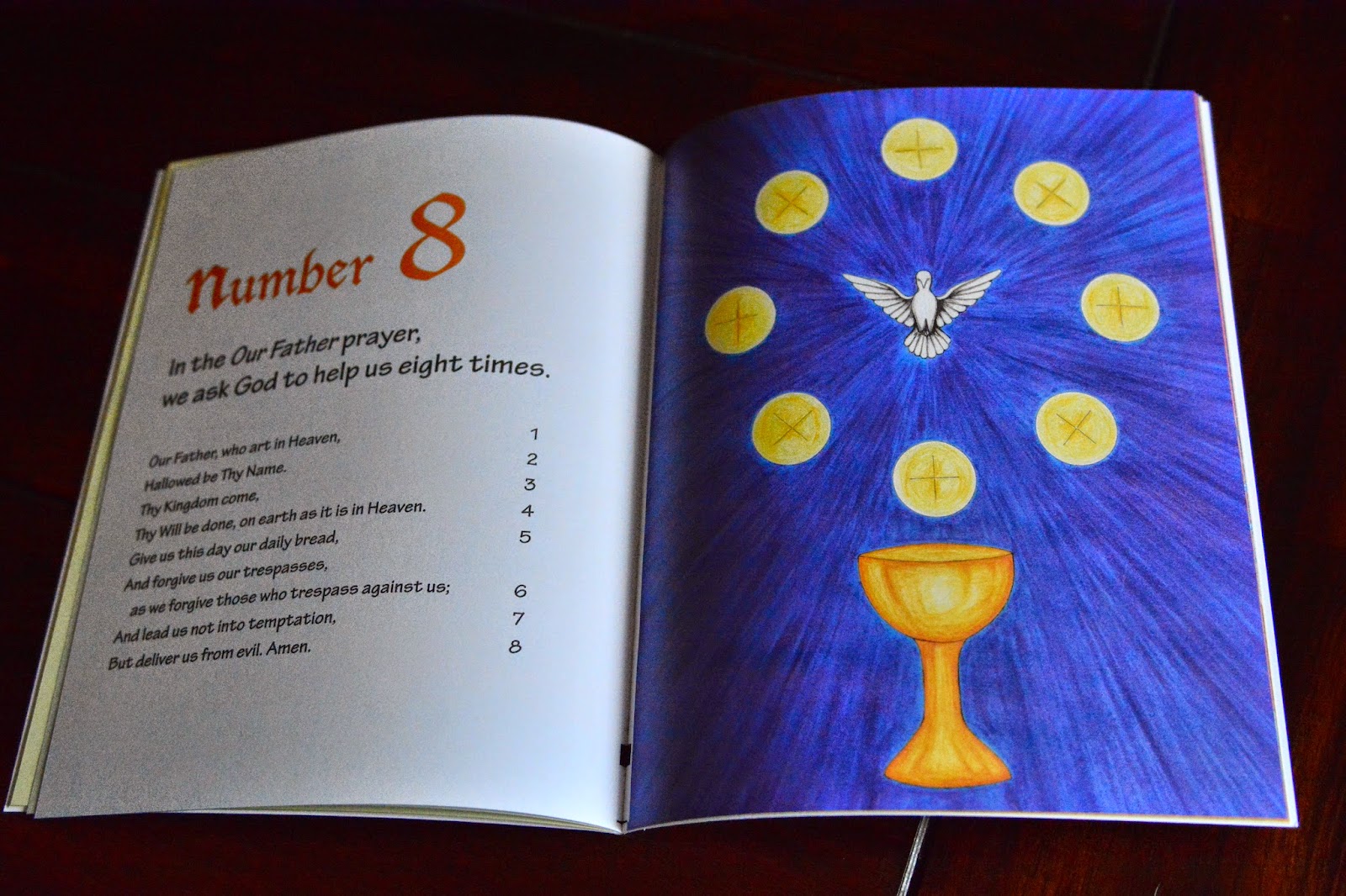 I feel like a lot of religious counting books are aimed at toddlers or young preschoolers who are just learning to count. These are great and fun books, but for those of us who are looking for something more, Counting on Faith is it! This book is perfect for someone who is not learning to count, but who is learning about the Catholic Faith. It helps teach the basics of the Holy Family, the Days of Creation, Jesus's Death, the Gifts of the Holy Spirit, important prayers like the Our Father, the Guardian Angels and the Ten Commandments.