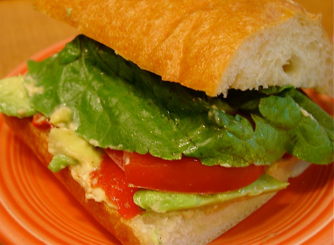I used jarred roasted red peppers, but if you want more zip to your sandwich, you may want to roast your own. By using the milder jarred peppers, more of the hummus flavor came through. You can use jarred hummus as well. I used my own -- recipe below. I think any of the ingredients in this sandwich can be increased or decreased according to your taste -- in my opinion, the more the merrier (and messier!)