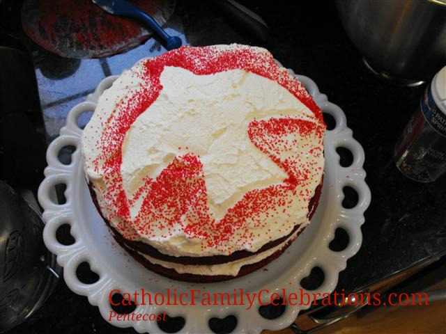 Pentecost is often said to be the birth of the Church, so a birthday cake makes a fine dessert. Here is a simple cake I often make (in any flavor) with the sign of the Holy Spirit on it. Candles can also be put on the cake as signs of the tongues of fire that landed upon the apostles’ heads.