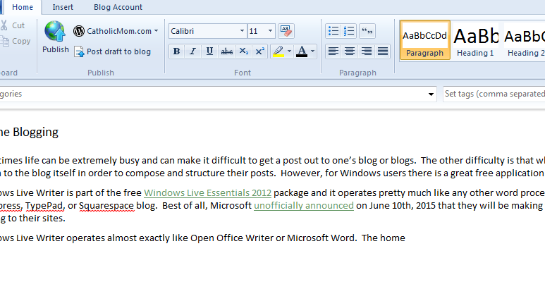 Windows Live Writer operates almost exactly like Open Office Writer or Microsoft Word. The home tab at the top allows users to select their font, font size, text formatting and other options. One of the differences writers may notice are the web-text formatting options such as paragraph and multiple heading sizes. There are also dropdown menus for things like blog categories and for tags so that authors can set up their post in the appropriate area of their sites. It will even let users schedule posts for a later date. Obviously publishing or saving a draft to a site has to be done when users are back online.