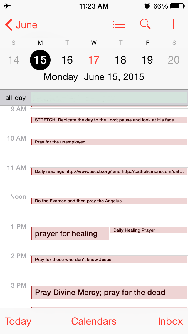 I set my Google Calendar to send me an e-mail each hour during the day (between 9am and 3pm) to remind me to offer short prayers for something in particular. I made the prayers a mixture of petitions, praise and thanksgiving, a quick examination of conscience, prayers for the sick and souls in purgatory, and formal prayers such as The Angelus at noon and a shortened version of the Divine Mercy at three in the afternoon. I chose a bell sound on my phone to notify me, not unlike what monks would hear at the abbey.