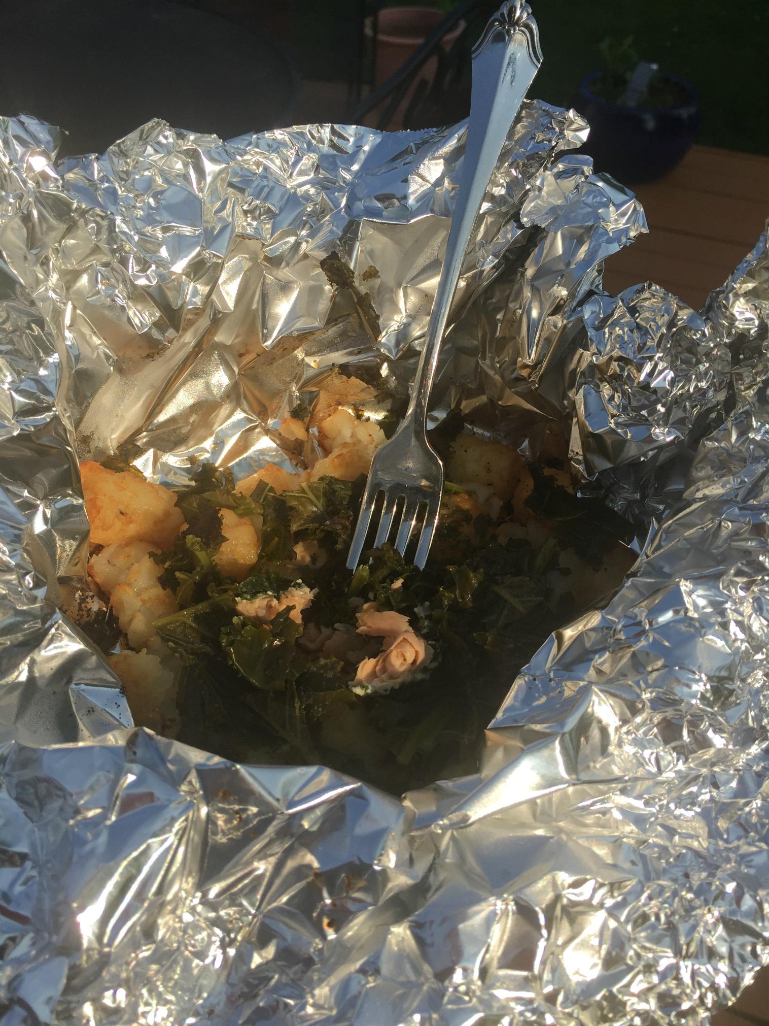 Spray each square of foil with nonstick cooking spray. Place salmon in center of foil, then top with tater tots and kale. Sprinkle with salt, lemon pepper, and lemon juice. Pinch corners of foil together above packet contents, then pinch edges together to create an air-filled pocket (this will help steam the contents). Grill over medium heat for about 10 minutes or until salmon flakes easily with fork and tater tots are cooked through (you'll be surprised at how well they brown up for you). Remove from heat and keep closed for five minutes before serving.