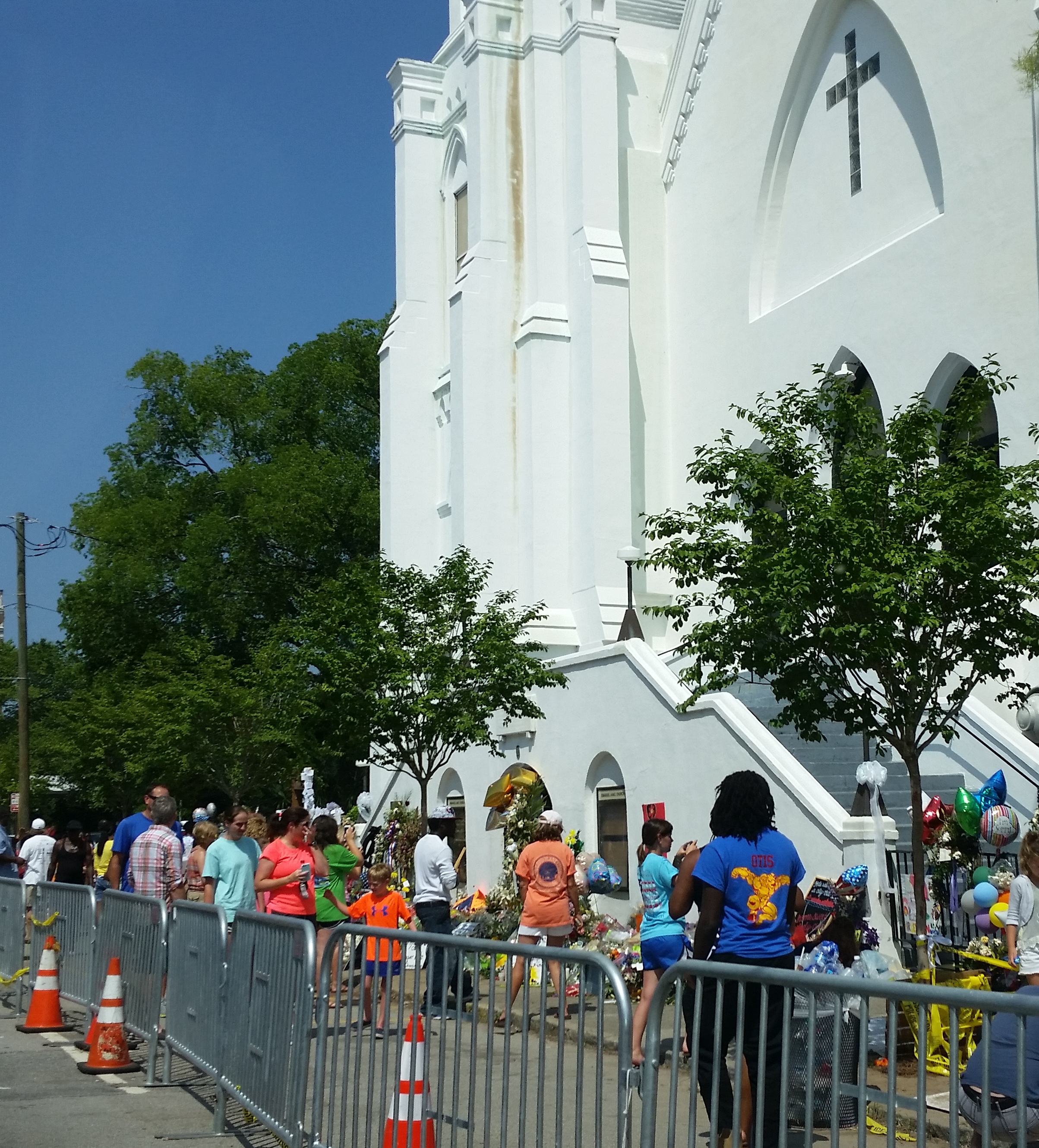The next morning, after a restless night of many rosaries, my community decided to say morning prayers at the AME Church. We needed to be present there. We needed to pray there even though we were praying in our chapel as well. The risk of being present was that of getting bombarded by news channels. No risk at all considering the risk nine people took when they invited a stranger into their Bible Study. We told the police we just wanted to pray. They let us in behind the police tape. Sr. Mary Thecla led the Office for the Dead from the Liturgy of the Hours. Being there and praying for those who died was powerful. The clicking of cameras reminded me of the clicking of rosary beads. To the credit of the media no one disturbed us until we were walking back to our car. We answered questions and gave testimony to Christ – the reason these people died.