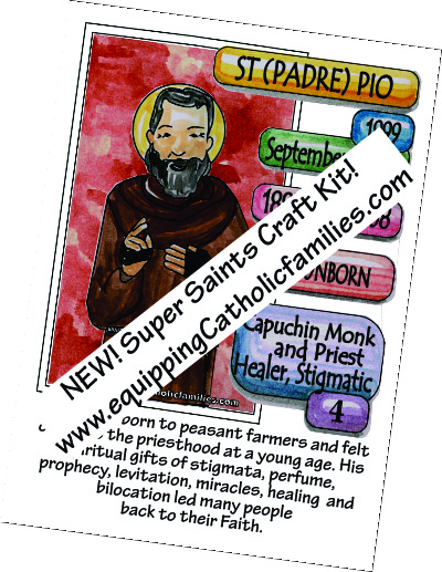 Monica, mom of 5, blogs about Catholic crafts and family traditions at EquippingCatholicfamilies.com. She is an author and creator of Super Saints quizzing cards and over 45 Saint, Sacrament, Catechism and Prayer-packed Craft Kits to help teach the Catholic Faith. The Catholic teaching tools and gifts are available through Arma Dei, the Catholic family publishing company founded with her husband Bill.