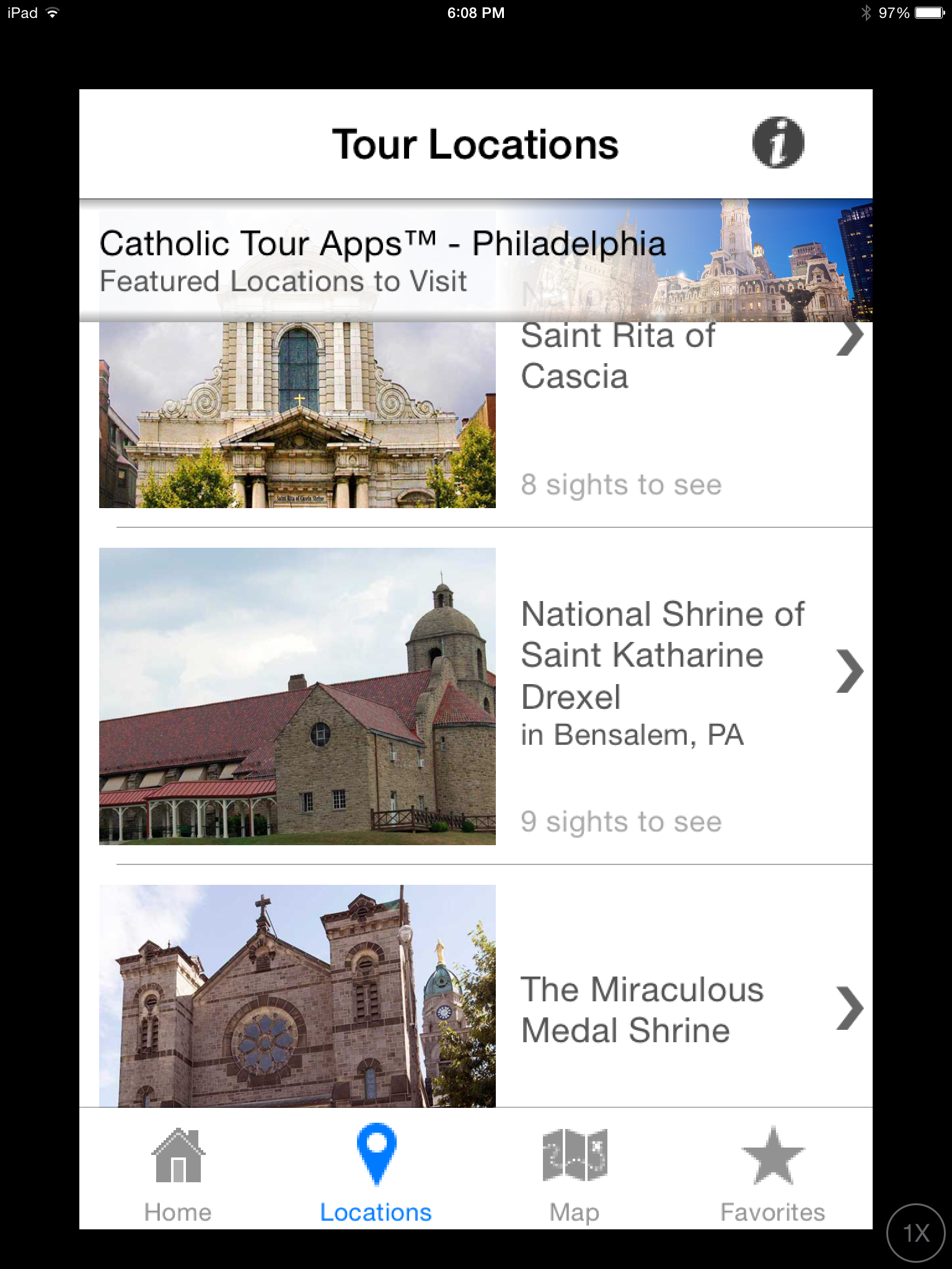 Receive a very warm introduction to both the City of Philadelphia and the Catholic Tour Apps from Fr. Joseph A. Genito, of the Order of St. Augustine, Shrine Director at the National Shrine of St. Rita. Next, determine which location you would like to learn about or visit first – there are 11 Featured Locations to Visit to choose from on this Catholic Tour Apps – Philadelphia. Each location has anywhere from 2 to 11 sights to see – which are highlighted with a beautiful image and helpful description, history or even a prayer to make the most of your visit there. You can even add any of the Sights to See in your Favorites!