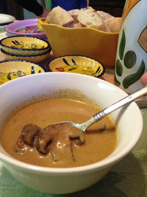 We showed up at church with the soup in one hand and our shiny stainless steel ladle in the other. We even made a Martha Stewart-inspired placard with “Creamy Roasted Mushroom Soup” written in fancy letters to identify the dish. As usual, it was a hit with the crowd. While chatting with our friends and fielding compliments on the soup, just over the din of the background noise from the direction of our crock-pot, we heard one hungry patron say out loud to nobody in particular, “Thank goodness someone remembered the vegetarians!” Joel and I looked at each other and didn’t say a word but communicated by eye contact that we were not going to spoil the vegetarian’s evening with the truth about the soup.