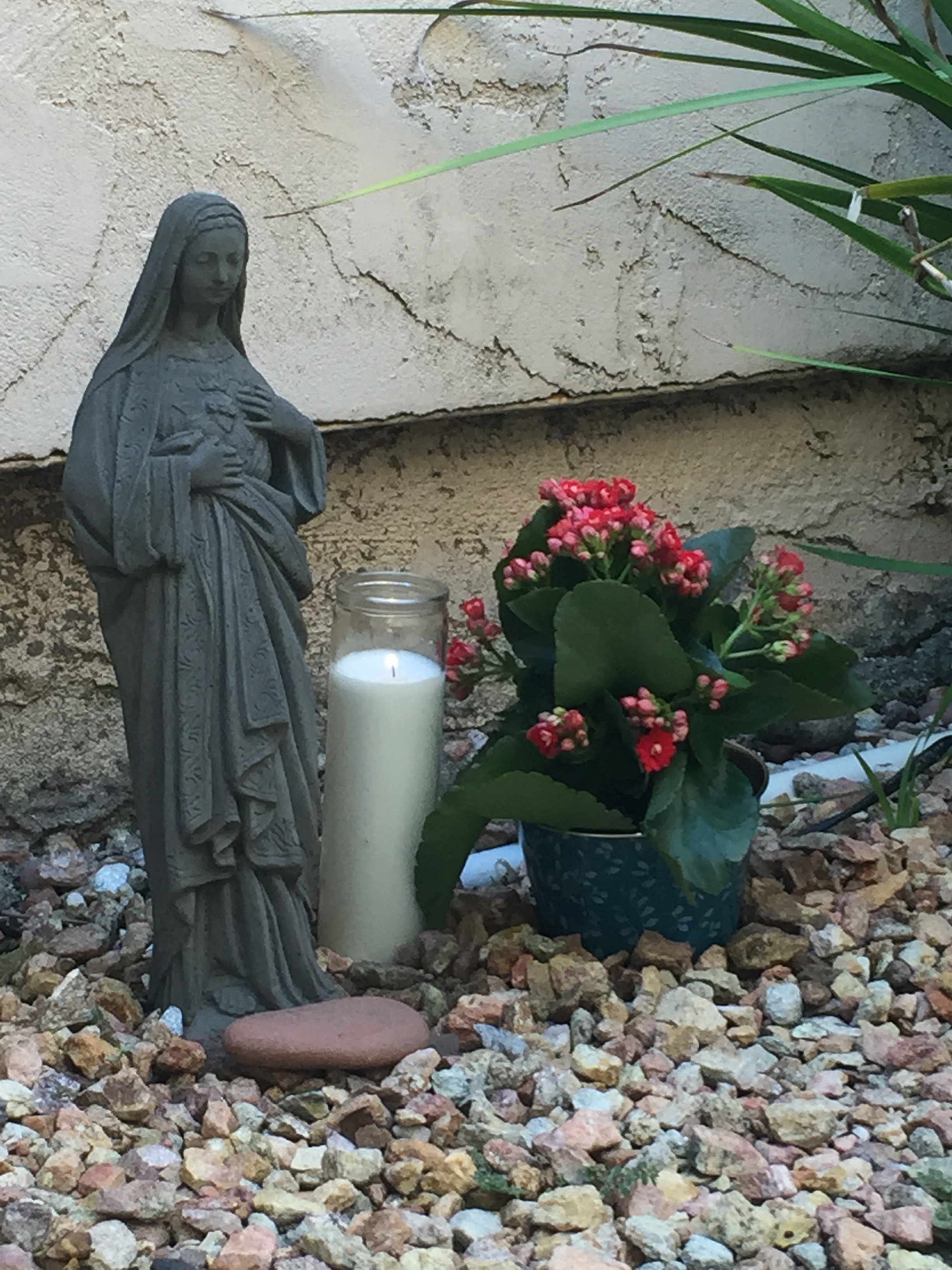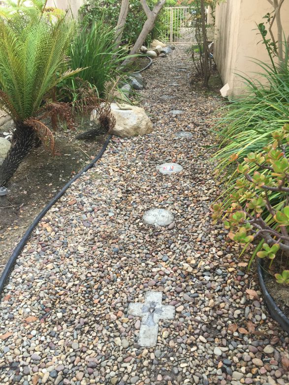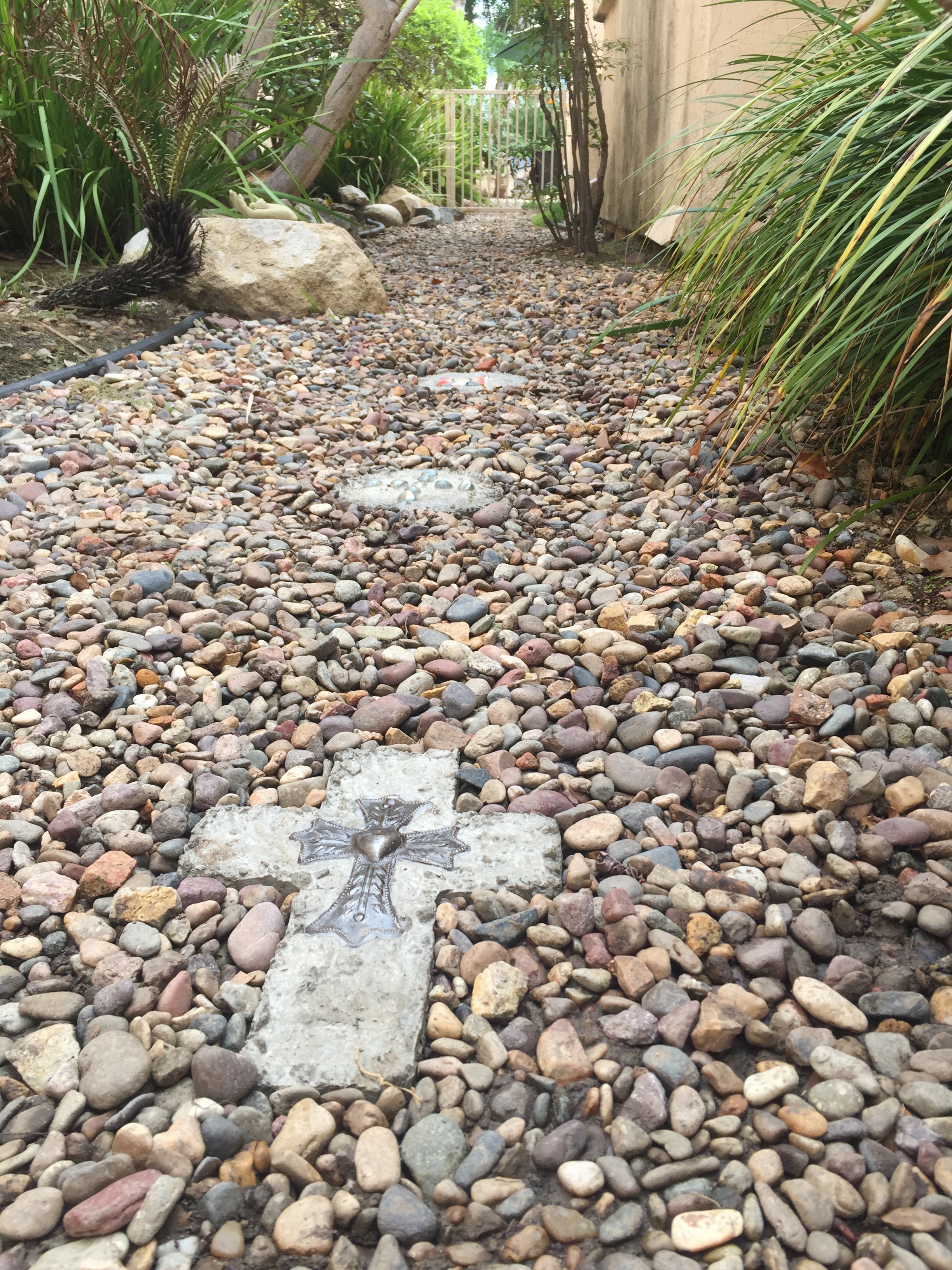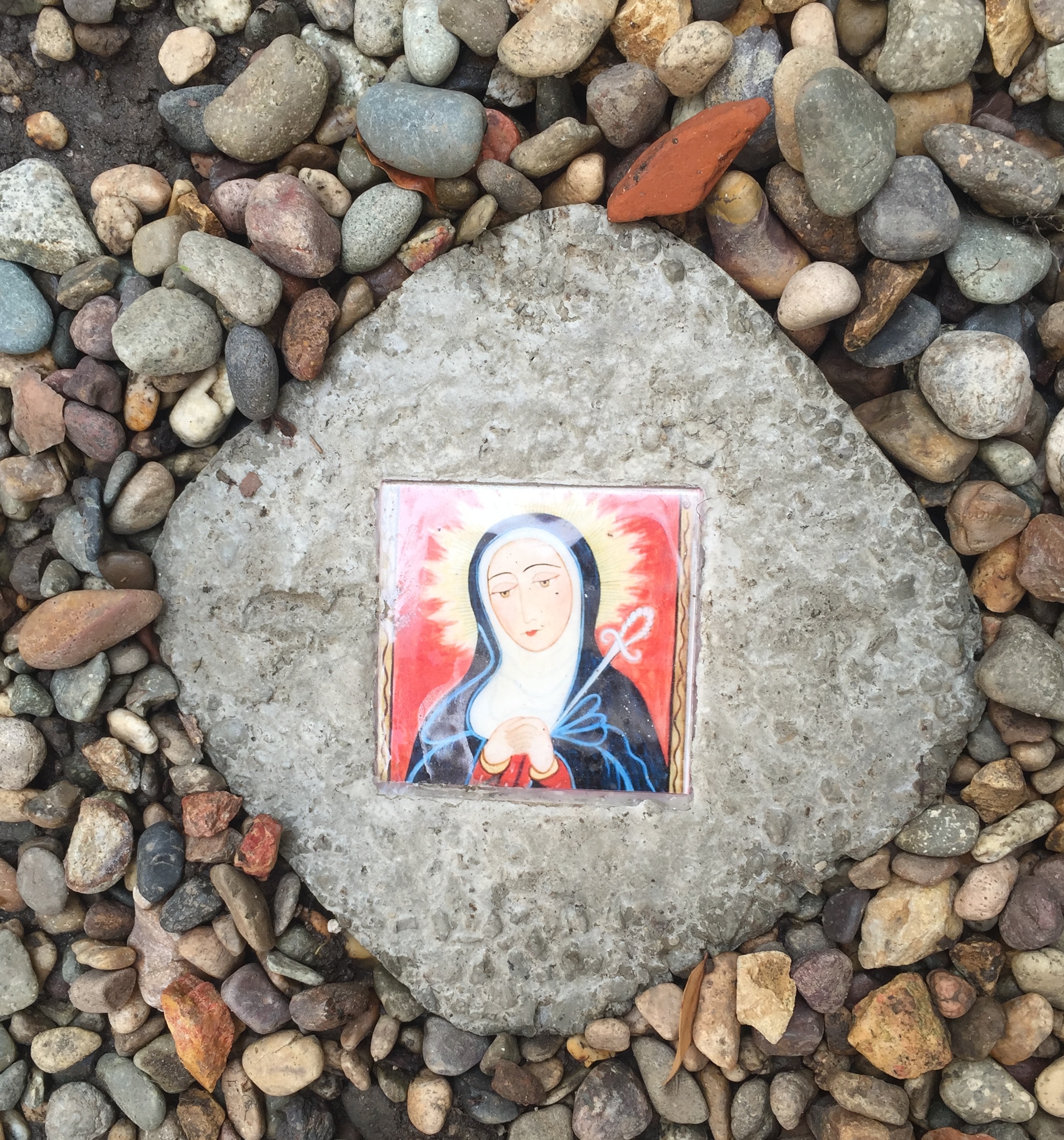 I realized (thank you, Holy Spirit) that something physical might be a better way to connect. In the pages of Catholic Traditions in the Home and Classroom: 365 Days to Celebrate a Catholic Year by Ann Ball, I found instructions for a “stepping rosary.” Although the instructions looked a little daunting at first, I prayed the result would be worth the mess and effort. We created a one decade stepping rosary for our side yard. Don’t be dismayed by the length of the directions! Once the supplies are gathered, the rest of it goes pretty quickly. Sort of quickly. Actually, not quickly at all, but consider it a small, redemptive sacrifice to Our Lady.