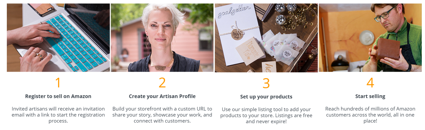 At this time, Amazon is only accepting artisans who make Jewelry, Home products (Art, Baby Bedding, Bath, Bedding, Furniture, Home Décor, Kitchen & Dining, Lighting, Patio, Lawn & Garden, Storage & Organization), Party Supplies and Stationery. If the products you sell aren’t in one of these categories, you can sign up to be notified as additional categories are added.