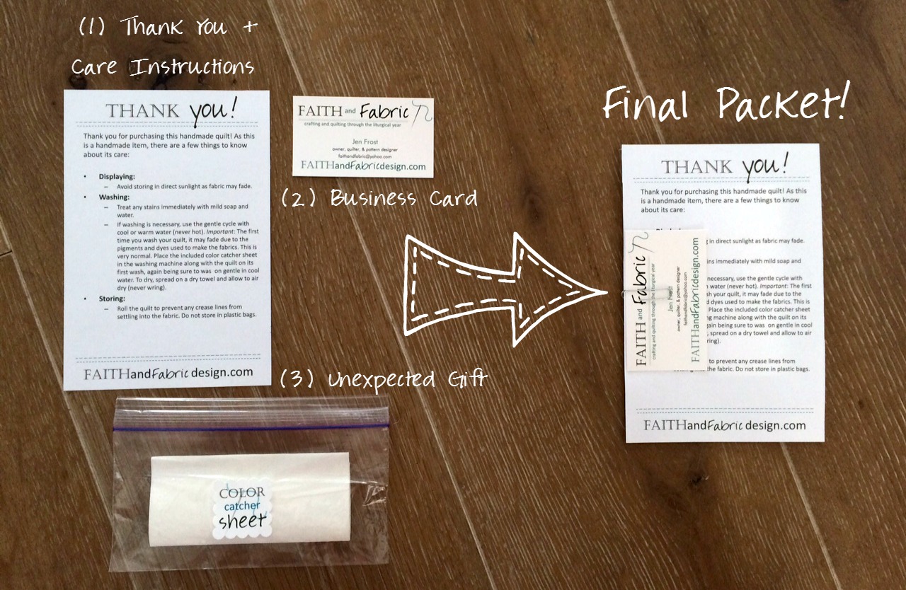 - Instructions for Use: Is there special care need for your gift? Instead of leaving the buyer to wonder how to clean, hang, wash, etc. your item, include a note with the relevant information. This is another opportunity to give it that personal touch; I include a color catcher along with the instructions for care (and a branded sticker on the bag) so buyers will know how to care for their liturgical quilts.