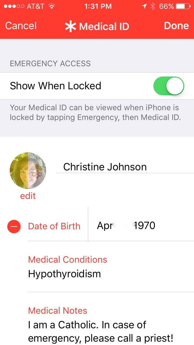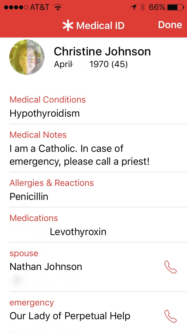 At the bottom of the screen inside the Health App, there's a small icon for Medical ID. In this app, your name, birthdate and age, and medical conditions are stored. You can add allergies and reactions, medications, and emergency contacts. This is all of the usual information that is suggested, but there's one more thing that Catholics can and should include in this area.