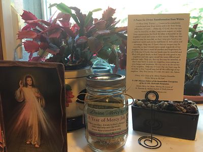 To reinforce the idea at home, I pulled out a large glass jar, filled it with rice and beans and placed it on the kitchen table. I labeled it our “Year of Mercy Jar” and put the Mary’s Meals website on it. It’s there as a reminder to all of us, as we fill our bellies at least three times a day, that many children in the world are hungry and if they get the opportunity to eat, it’s a very simple meal of beans and rice. I took a second jar to collect money from small sacrifices we will make this year and placed it on my kitchen window next to my Divine Mercy Image and the Prayer of Divine Transformation from the Diary of St. Faustina.