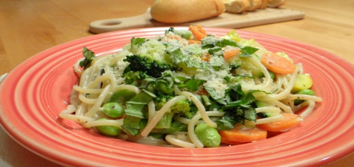 This dish is often served in the spring when spring's vegetables are just ripening in the garden. With the abundance of produce available in grocery stores, however, this dish is great all year 'round. And a plate of hot pasta is often just the thing for a Friday night dinner. Comforting and nutritious, this dish will warm your insides at the end of the week. For picky eaters, you can serve plain pasta, or pasta with just the cream sauce, and maybe some veggies to eat with fingers on the side. This is a lightened version of Pasta Primavera, but if you have no need to go light, feel free to use all or half cream instead of the half-and-half, and reduce or omit the cornstarch as necessary to thicken.