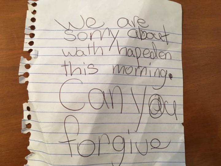 So, I'm left learning the power of forgiveness from my daughter. I'm left with the impression on my heart of the impact of a hand-written apology note. Hopefully I'll take this lesson as a teaching moment for myself and remember this as an option next time I need to ask someone for forgiveness.