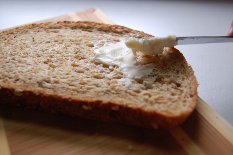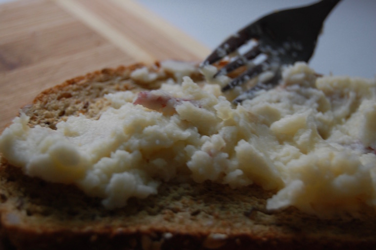 Next, spread about 2-oz. (or more) of brie cheese on the other slice of bread. This is an ingredient that you may not have on hand, but it is well worth the trip to the grocery store.