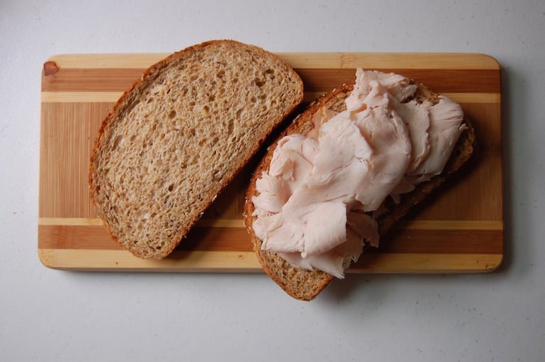 Layer one slice of your bread of choice first with lots of turkey. Shown in the photograph are two slices of multigrain panini bread. However, you can also use whatever bread your family may have leftover from Thanksgiving day. If you want to add the optional gravy to your sandwich, go ahead and drizzle some over your turkey.