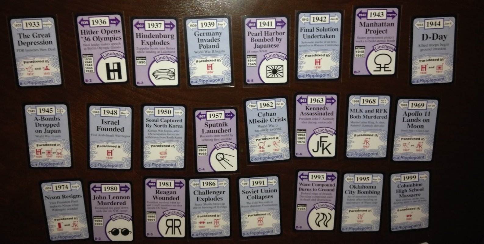 The Purple cards are Linchpins and can be flipped by cards in the deck, and the Blue cards are Ripplepoints and flip when corresponding purple cards flip. For example, If you flipped 1865 from black text to red text, Lincoln Assassinated to Lincoln Wounded, that would trigger you to flip 1868 Johnson Impeached, because Johnson couldn't be impeached if Lincoln never died. Thus, a paradox is created. Before I get to paradoxes, let me tell you about cards you will draw during your gameplay.