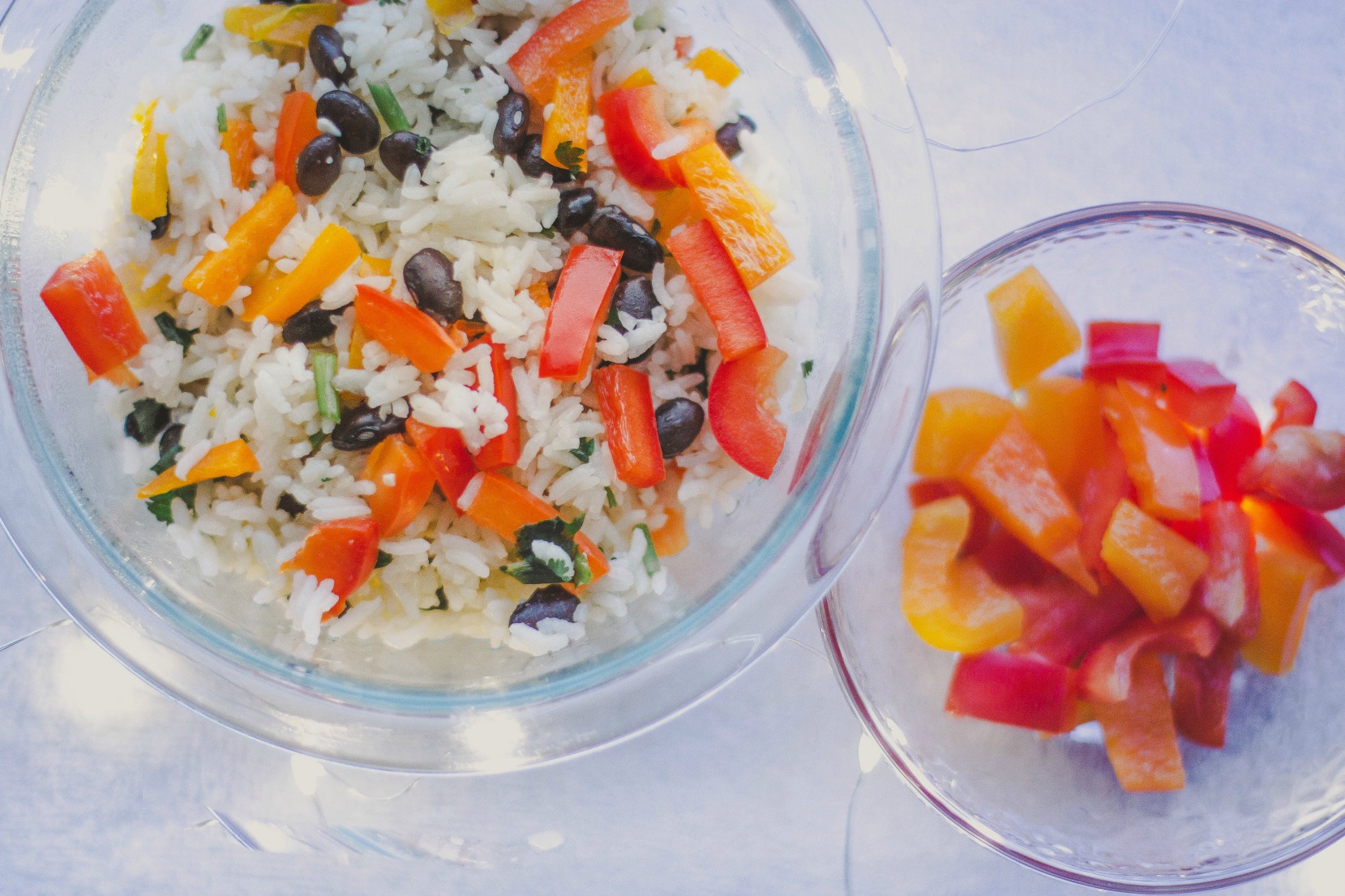 Cook the rice according to package directions. Saute prepared peppers and onion in 1 Tablespoon of the coconut oil; set aside. When the rice is done, fry it in a large frying pan or skillet for 2-3 minutes with the rest of the coconut oil. Add the saute mix, black beans, cilantro, garlic, & lime juice and heat briefly. Serve it up on tacos, quesadillas, nachos or eat it just by itself.
